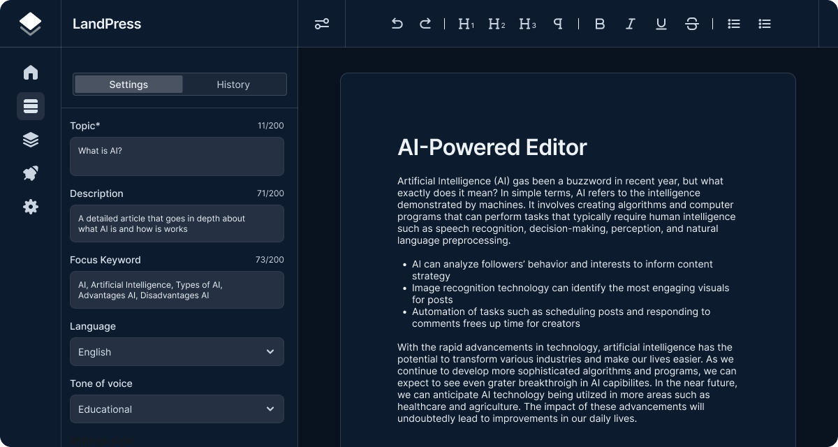 Generate SEO-friendly content effortlessly and watch your organic traffic soar with our AI-powered writing tool.